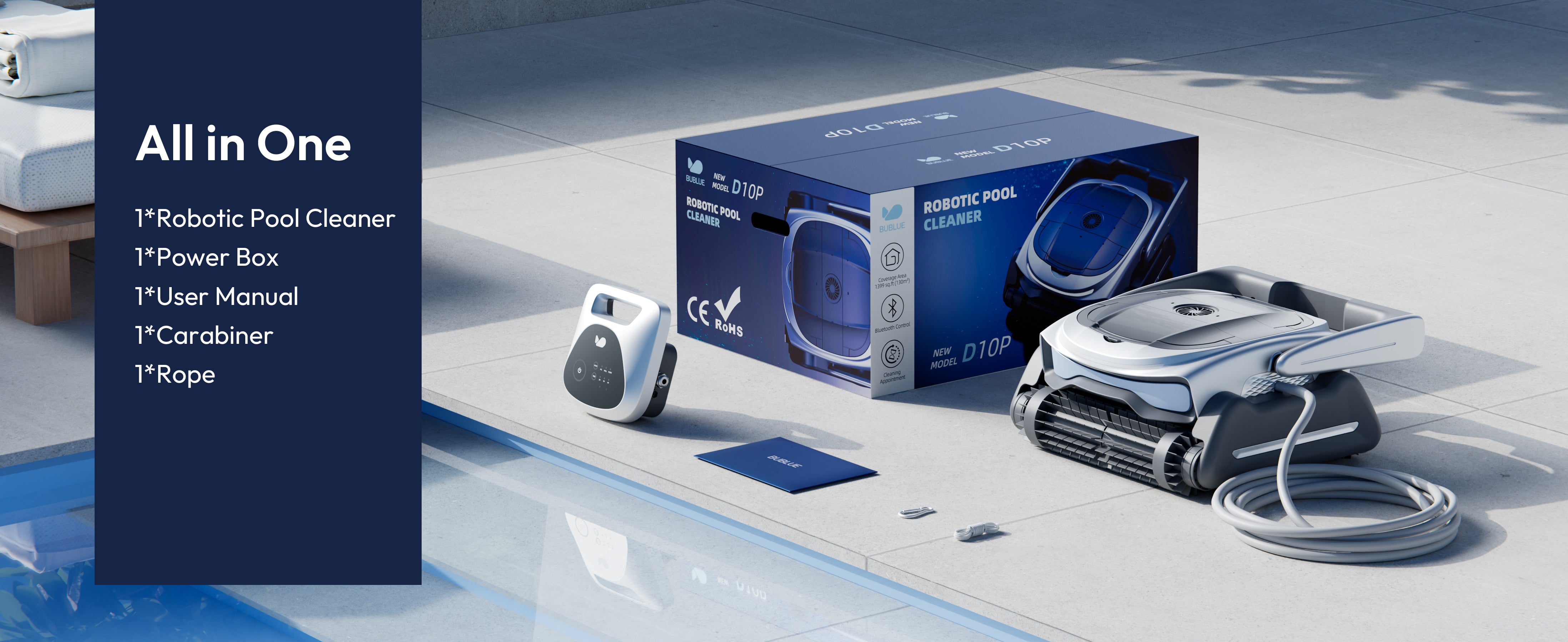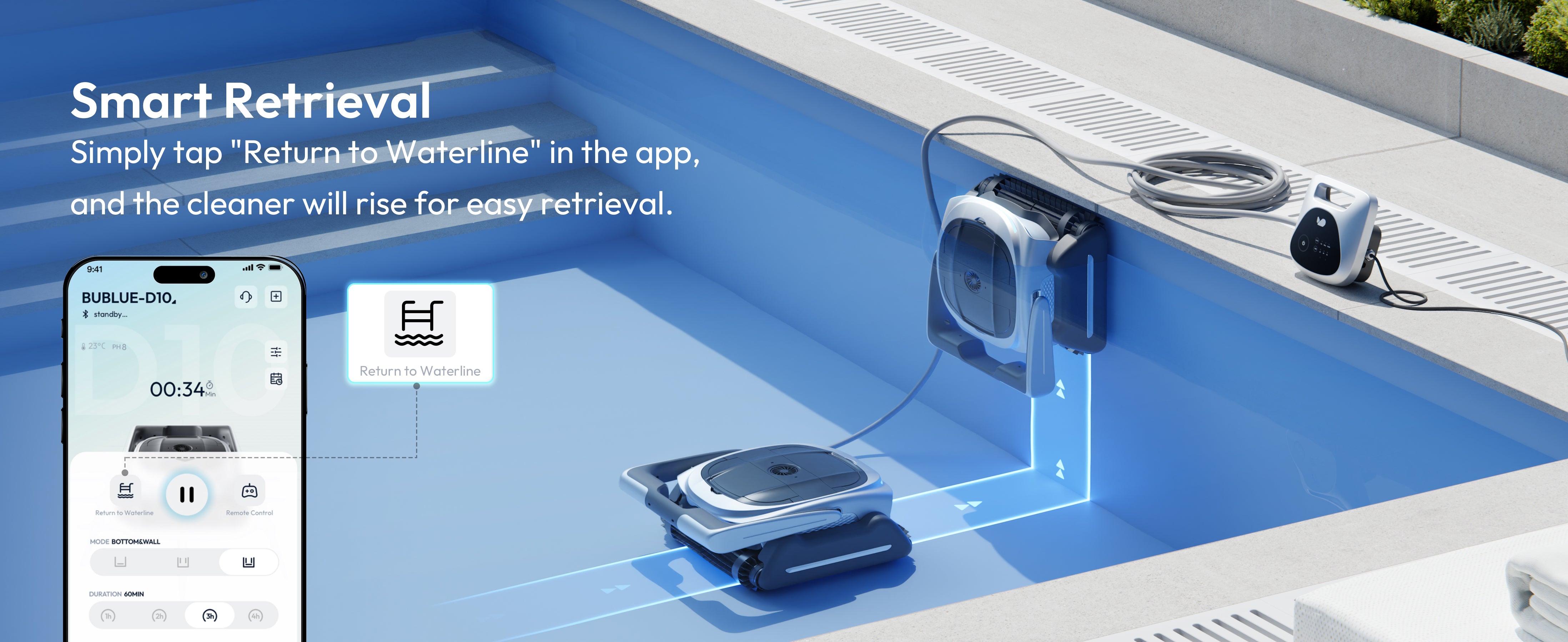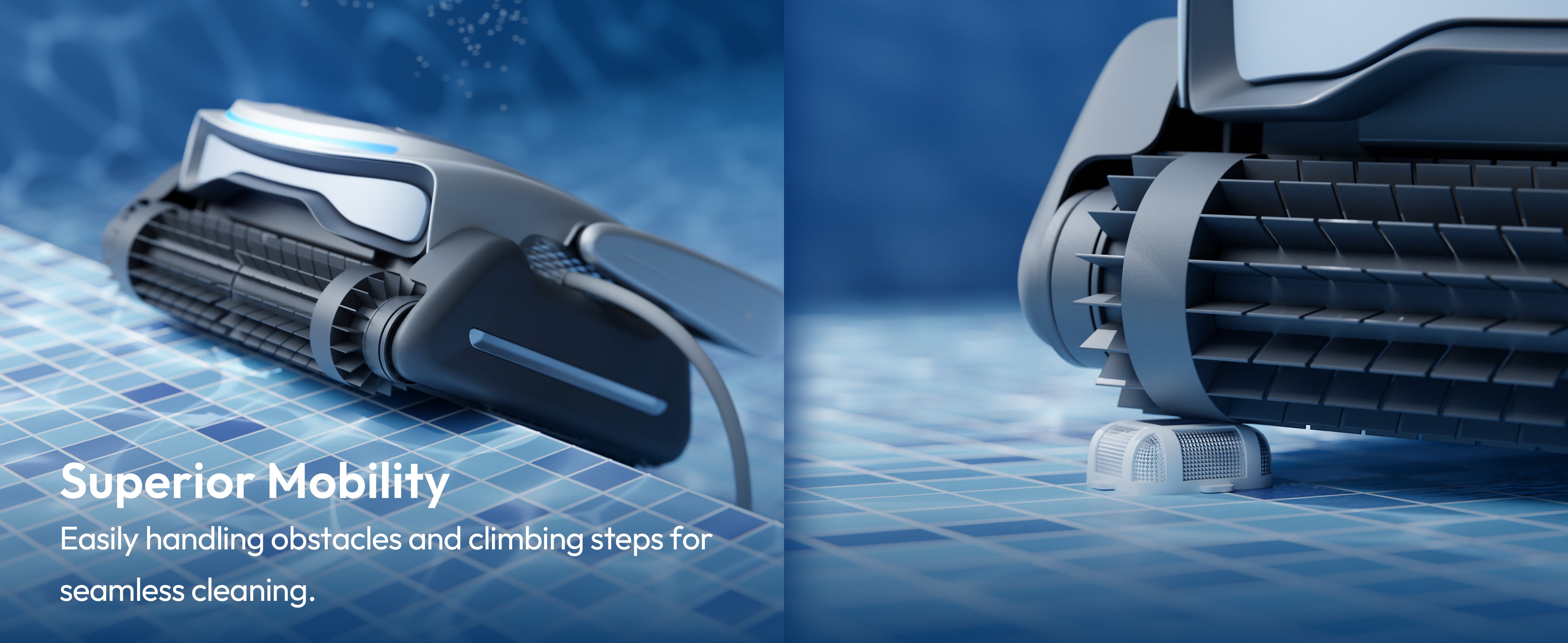 Thanks to its advanced drive system and robust structural design, the 800P easily avoids obstacles and climbs slopes or steps. It moves smoothly between deep and shallow areas for complete pool coverage.
